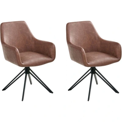 Upholstered Chair on Swivel Base. This set of two dining chairs makes a stylish and practical addition to any modern home. Upholstered in soft, durable faux leather, they feature a classic bucket-shaped seat. The look is finished with sleek black metal legs and a handy 180-degree swivel function, making them effortlessly versatile for everyday dining. Details: Product Type: Dining Chair General Color: Brown, Black Frame Colour: Black Material Type: Faux Leather Main Material: Faux Leather Additional Material: Iron Filling Material: Foam Frame Material: Metal Legs material: Metal Seat Material: Faux Leather Material Composition: 100% PU Leather Armrests: Yes Stackable: No Dimensions: Armrests Height: 63 cm Depth: 59 cm Seat Thickness: 10 cm Seat Height: 49 cm Width: 57 cm Height: 85 cm Seating Surface: 42x40 cm Weight: 9 kg Weight Capacity: 120 kg Offer Includes: 2 x Chair Key Features: 180° Swivel, Curved Shape for Maximum Comfort, Timeless Design, Makes Your Interior Stylish,