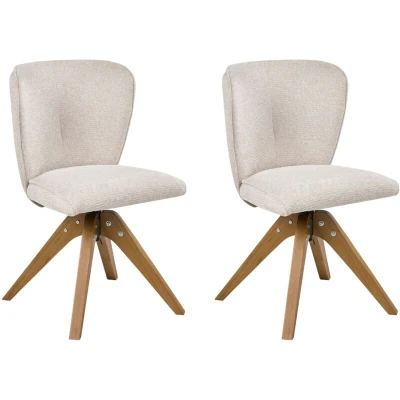 2 Piece Swivel Chairs Set with Wooden Legs. Created for both style and everyday practicality, this set of dining chairs is an excellent choice for modern homes. The chairs are upholstered in high-quality fabric that is water repellent, making them ideal for busy households. A 360-degree swivel seat adds comfort and flexibility, allowing effortless movement at the table. The softly shaped backrest and padded seat provide supportive, comfortable seating. Solid wooden legs complete the design with stability and a natural, warm finish. Details: Product Type: Dining Chair Style: Minimalist General Color: Beige, Brown Frame Colour: Brown Shade: Light Beige Material Type: Fabric Main Material: Fabric Additional Material: Plywood Frame Material: Wood Legs material: Wood Seat Material: Fabric Material Composition: 95% Polyester Armrests: No Stackable: No Dimensions: Depth: 64 cm Seat Height: 49 cm Width: 64 cm Height: 84 cm Seating Surface: 47x43 cm Weight: 11 kg Weight Capacity: 100 kg Offer