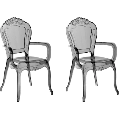 General description A whimsical interpretation of a classic French style, this set of 2 dining chairs will make a grand statement in every dining or living area. Crafted from high-quality acrylic, these chairs are robust and long-lasting while maintaining a light and airy appearance. The elegant black-transparent color combined with fancy ornaments creates a perfect accent seat for contemporary or vintage-inspired interiors, charming the area that surrounds them with their uniqueness. Technical specifications Product Type: Banquet Chair Style: Glam General Color: Black Frame Colour: Black Main Material: Polycarbonate Legs Material: Synthetic Material Seat Material: Synthetic Material Armrests: Yes Finish: Gloss Stackable: Yes Dimensions: Armrests Height: 67 cm, Depth: 53 cm, Seat Height: 45 cm, Width: 52 cm, Height: 98 cm, Seating Surface: 43x42 cm Weight: 5 kg Weight Capacity: 200 kg Usage Perfectly fitted armrests for comfort Timeless design suitable for various interiors Decorative