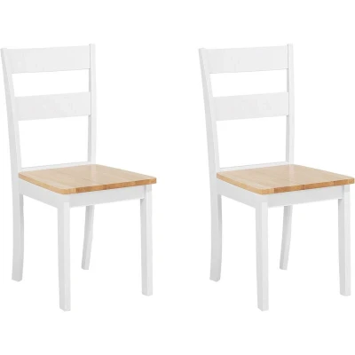 General description This set of 2 cottage-inspired dining chairs will create the perfect centerpiece in your dining room or kitchen. They add a charming farmhouse vibe, brightening up your decor with their unique design. The chairs feature a wooden seat with a natural finish and white legs, combining beautifully with the warm, light color of the wood. Enjoy the excellent design and solid, high-quality construction that ensures longevity and durability. Technical specifications Product Type: Dining Chair Style: Traditional General Color: White, Brown Frame Colour: White Main Material: Rubberwood Legs Material: Wood Seat Material: Wood Armrests: No Finish: Lacquered Stackable: No Dimensions: Depth: 43 cm, Seat Height: 42 cm, Width: 45 cm, Height: 89 cm, Seating Surface: 40x40 cm Weight: 6 kg Weight Capacity: 80 kg Installation Full assembly required (20-40 min). Usage To ensure stability and safety, check if the product has been properly assembled 2 weeks after setup. Check if screws
