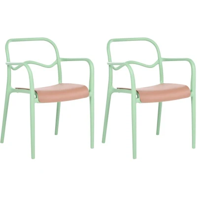 Synthetic Outdoor Dining Chairs. This set of 2 retro garden chairs offers a stylish and practical seating solution for any outdoor space. Crafted from durable, lightweight synthetic material, they’re designed to withstand changing weather conditions and can be stacked for easy storage. The vibrant design brings a pop of colour to your garden or patio. Details: Product Type: Dining Chair General Color: Green, Brown Material Type: Synthetic Material Main Material: Polypropylene Legs material: Synthetic Material Seat Material: Synthetic Material Armrests: Yes Finish: Matt Foldable: No Stackable: Yes Dimensions: Armrests Height: 66 cm Depth: 57 cm Seat Height: 47 cm Width: 57 cm Height: 80 cm Seating Surface: 40x43 cm Weight: 5 kg Weight Capacity: 120 kg Offer Includes: 2 x Chair Key Features: Adds Warmth to Outdoor Space, UV Resistance, Easy Care and Durable Materials, Easy To Store Thanks to Stackable Feature, Leg Caps for Surface Protection Assembly Information: Partial Assembly