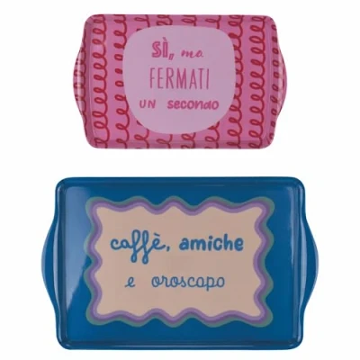 Set of 2 trays More Amor Melamine Decoration with inscription: coffee, friends and horoscope; yes but stop a second Large tray measurements: L. 46 x D. 29 cm. Small tray measures: L. 38.5 x d. 24 cm Colour: blue bottom and pink bottom Hand wash recommended, if in the dishwasher store in the top shelf Not suitable for microwave use Avoid direct contact with food Set of 2 More Amor Trays, Melamine Decoration with saying: coffee, friends and horoscope; yes but stop for a second; Large tray measurements: L. 46 x d. 29 cm Small tray measurements: L. 38.5 x 24 cm; Colour: blue bottom and pink bottom Hand wash recommended, if in the dishwasher store in the top shelf; Not suitable for microwave use