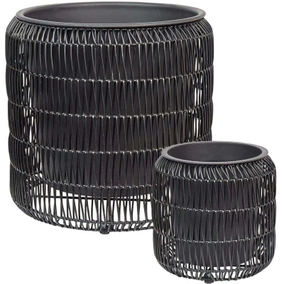 General description Set of 2 Faux Rattan Planters. If you wish to add an extra touch to your plants, place them in this set of two round plant pots. Boasting a contemporary braided look and an openwork structure, they are crafted from resilient PE rattan. Each piece comes complete with a fitting plastic pot, ready for planting your flowers. Whether for your home or terrace, these pots will enhance the decor with a natural feel. Technical specifications Product Type: Indoor Plant Pot Style: Rustic General Color: Black Main Material: PE Rattan Additional Material: Steel Shape: Round Drainage Holes: Yes Finish: Powder Coated Insert Required: No Max. temperature: 40°C Min. temperature: -20°C Capacity: 6/30 liters Dimensions: Depth: 26/45 cm, Width: 26/45 cm, Height: 29/46 cm Weight: 4 kg Usage Suitable for both indoor and outdoor use To prolong the life of the furniture, protect it from direct sun exposure Clean with soap-based cleaners; avoid caustic, chemical cleaners During off-season,