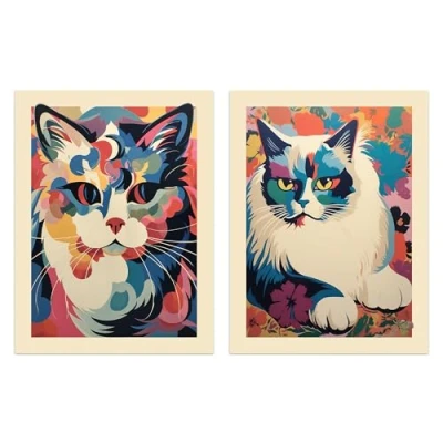 Set of 2 Prints Colourful Cats Multicoloured Moggies Pack A4 Poster Living Room Wall Art