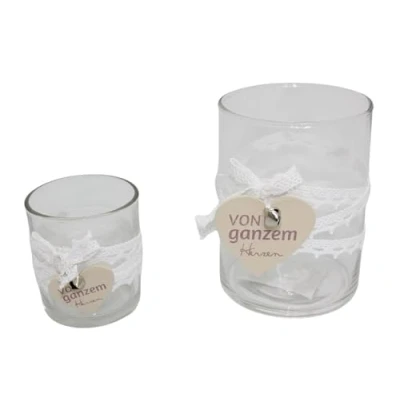 Set of 2 Round Glass Candle Holders with Wooden Heart Transparent 10 x 15 cm