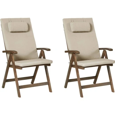 Set of 2 Rustic Garden Chairs Natural Acacia Wood Adjustable Foldable with Armrests Taupe Cushions Amantea Premium