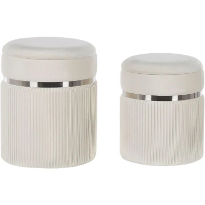 General description Adorn your room with this glamorous set of 2 decorative pouffes. Upholstered in high-quality velvet, they feature glossy metal bands that divide them into two parts: one plain and one pleated. Hidden behind a lid on the seat, there is an ample storage compartment, making them a great addition to any living room or bedroom. Technical specifications Product Type: Pouffe Style: Glam General Color: Off-White Main Material: Velvet Additional Material: Plywood Filling Material: Foam Material Composition: 100% Polyester Shape: Round Seat Foam Density: 25 kg/m3 Weight: 5 kg Weight Capacity: 150 kg Dimensions: Depth: 36/31 cm, Width: 36/31 cm, Height: 44/38 cm Seating Surface: 36x36/31x31 cm Usage Perfect for both a bedroom and a living room Elegant design with a decorative, vertical quilt Functional deep storage space Maintenance tips: Clean with dry shampoo and a wet sponge or a mild cleaner; Vacuum with a suitable attachment Other information Please keep in mind that