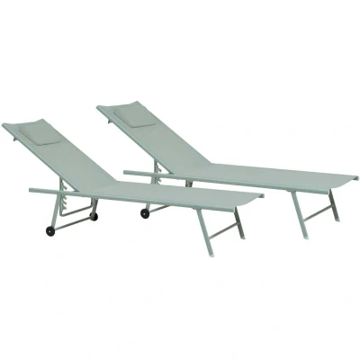 General description Relax in style with this set of 2 comfortable sun loungers. Built on a stable steel frame, each lounger features durable seating material and a five-position adjustable backrest. A headrest equipped with a small cushion adds extra support, making the loungers perfect for long hours of outdoor lounging in the garden, patio, or by the pool. Technical specifications Product Type: Sun Lounger Style: Modern General Color: Green Frame Colour: Light Green Material Type: Metal Main Material: Steel Additional Material: Fabric Material Composition: 30% Polyester Adjustable Backrest: Yes Dimensions: Depth: 149 cm, Seat Height: 29 cm, Width: 55 cm, Height: 95 cm Weight: 14 kg Weight Capacity: 120 kg Compatibility and accessories Offer Includes: 2 x Garden Lounger, 2 x Headrest Installation Partial Assembly Required (20-40 min) Usage Light water resistance allows outdoor use during light rain and humid conditions. If not possible to store indoors, use a cover when not in use.