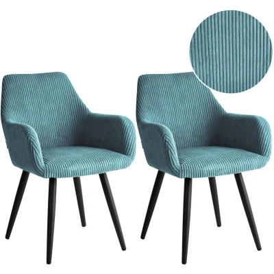 Upholstered Chairs with Armrests. This elegant set of two chairs brings a refined, contemporary feel to dining and living spaces alike. Upholstered in soft corduroy fabric, the chairs provide a plush, comfortable seat while adding a subtle touch of luxury to your interior. The gently contoured shape offers supportive seating, ideal for long meals or relaxed gatherings. Sleek metal legs ensure strength and stability, completing the modern design with a clean, sophisticated finish. Details: Product Type: Dining Chair Style: Retro General Color: Blue Frame Colour: Black Shade: Turquoise Material Type: Fabric Main Material: Corduroy Additional Material: Iron Frame Material: Metal Legs material: Metal Seat Material: Fabric Material Composition: 100% Polyester Armrests: Yes Finish: Powder Coated Stackable: No Dimensions: Armrests Height: 66 cm Depth: 64 cm Seat Height: 48 cm Width: 56 cm Height: 83 cm Seating Surface: 44x41 cm Weight: 7 kg Weight Capacity: 120 kg Offer Includes: 2 x Chair