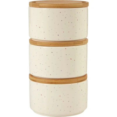 JoybuyThe Fenwick Set of 3 Stackable Canisters offers durable, stylish storage for kitchen essentials with tough dolomite bodies, colorful speckle patterns, and eco-friendly bamboo lids featuring inner seals for freshness. Designed for everyday use, they stack neatly to save space while adding a decorative touch to any kitchen.