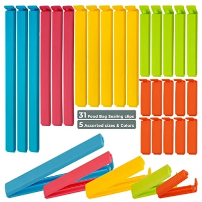 Set of 31 Food Bag Clips for Storage in 5 Assorted Sizes & Colours, Convenient Keeping Fresh, Unique Design Reusable Plastic Snacks, Coffee, Air Tight.