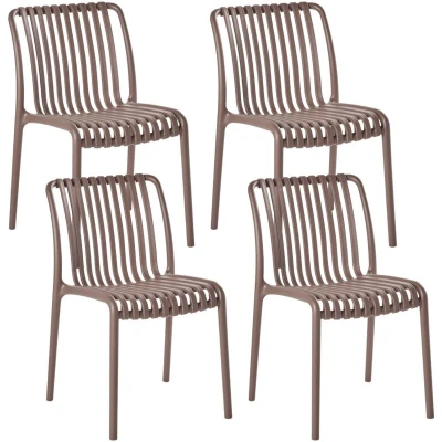 4 Plastic Chairs for Indoor and Outdoor Use. Sleek and contemporary, this set of 4 garden chairs is designed to bring both style and comfort to your outdoor space. With their open-back slatted design and minimalist silhouette, these chairs strike the perfect balance between modern aesthetics and laid-back summer vibes. Made from durable, weatherproof plastic, they’re built to last through countless sunny lunches and poolside drinks. Lightweight yet sturdy, they’re easy to move around and stack away when not in use. Whether you're entertaining guests or simply enjoying the sun, these chairs are a reliable and chic choice for any terrace, patio or balcony. Details: Product Type: Dining Chair Style: Modern General Color: Brown Material Type: Synthetic Material Main Material: Polypropylene Legs material: Synthetic Material Seat Material: Synthetic Material Armrests: No Foldable: No Stackable: Yes Dimensions: Depth: 50 cm Seat Height: 46 cm Width: 44 cm Height: 78 cm Seating Surface: 40x39