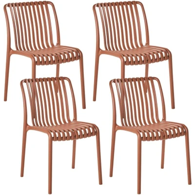 4 Plastic Chairs for Indoor and Outdoor Use. Sleek and contemporary, this set of 4 garden chairs is designed to bring both style and comfort to your outdoor space. With their open-back slatted design and minimalist silhouette, these chairs strike the perfect balance between modern aesthetics and laid-back summer vibes. Made from durable, weatherproof plastic, they’re built to last through countless sunny lunches and poolside drinks. Lightweight yet sturdy, they’re easy to move around and stack away when not in use. Whether you're entertaining guests or simply enjoying the sun, these chairs are a reliable and chic choice for any terrace, patio or balcony. Details: Product Type: Dining Chair Style: Modern General Color: Red Shade: Light Red Material Type: Synthetic Material Main Material: Polypropylene Legs material: Synthetic Material Seat Material: Synthetic Material Armrests: No Foldable: No Stackable: Yes Dimensions: Depth: 50 cm Seat Height: 46 cm Width: 44 cm Height: 78 cm Seating