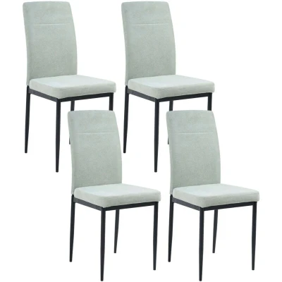 Elegant Armless Chairs Set. With their simple, yet elegant design, these four dining chairs are a perfect addition to any modern dining room. Their soft upholstery in a neutral tone complements the black metal legs, creating a stylish contrast. Comfortable and practical, these chairs provide the ideal seating for family meals or gatherings with friends. Details: Product Type: Dining Chair Style: Minimalist General Color: Green, Black Shade: Light Green Material Type: Fabric Main Material: Fabric Additional Material: Iron Frame Material: Metal Legs material: Metal Seat Material: Fabric Material Composition: 100% Polyester Armrests: No Finish: Powder Coated Stackable: No Dimensions: Depth: 50 cm Seat Thickness: 6 cm Seat Height: 50 cm Width: 42 cm Height: 94 cm Seating Surface: 42x41 cm Weight: 4 kg Weight Capacity: 150 kg Offer Includes: 4 x Chair Key Features: Very Comfortable, Great Relaxation Spot, Elegant Design, High-Quality Upholstery, Robust Frame Assembly Information: Partial