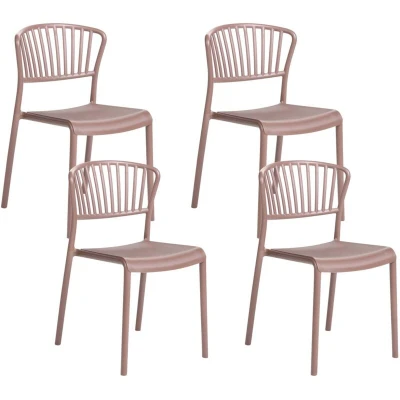 4 Plastic Chairs for Indoor and Outdoor Use. With its decorative and functional design, this set of chairs is perfect for any interior as well as backyard or a balcony. The chairs are made from plastic, so no summer shower can damage them. They are also stackable to make it easier to store them. The slightly curved, spindle backrest and pastel colour gives them a retro feel. In the dining room, kitchen, or garden, these chairs will fit nicely everywhere, adding a touch of colour to the space. Details: Product Type: Dining Chair General Color: Brown Material Type: Synthetic Material Main Material: Polypropylene Legs material: Synthetic Material Seat Material: Synthetic Material Armrests: No Foldable: No Stackable: Yes Dimensions: Depth: 50 cm Seat Height: 40 cm Width: 45 cm Height: 78 cm Seating Surface: 35x40 cm Weight: 4 kg Weight Capacity: 150 kg Offer Includes: 4 x Chair Key Features: Trendy Design and Colour, Chic Look, Both for Indoor and Outdoor Use, Sturdy Frame Construction,