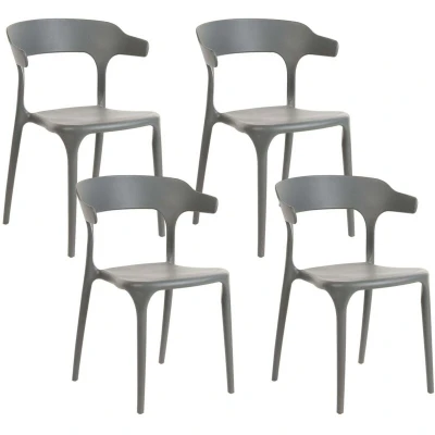 Indoor/Outdoor Dining Chairs. A comfortable seating is what every indoor and outdoor area needs to become a welcoming place for dining and spending time with family. This set of chairs will serve this purpose perfectly. Made of high quality synthetic materials, they feature round backrest and wide seating part for proper comfort. The contemporary yet unique design makes these chairs an excellent piece of furniture for modern and minimalistic interiors. Thanks to the materials they were manufactured from, the chairs can be used either in home or garden. Details: Product Type: Dining Chair General Color: Grey Material Type: Synthetic Material Main Material: Polypropylene Legs material: Synthetic Material Seat Material: Synthetic Material Material Composition: 100% Polypropylene Armrests: No Finish: Matt Foldable: No Stackable: Yes Dimensions: Depth: 49 cm Seat Height: 42 cm Width: 50 cm Height: 76 cm Seating Surface: 41x42 cm Weight: 4 kg Weight Capacity: 150 kg Offer Includes: 4 x