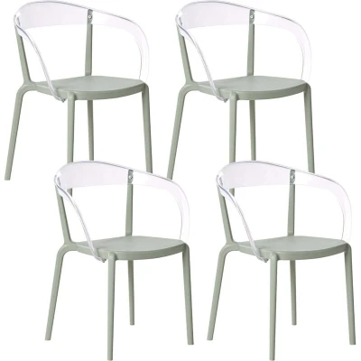 4 Synthetic Chairs for Outdoor and Indoor. Designed for everyday comfort, this set of four chairs is a great choice for both indoor and outdoor use. Made from weather- and UV-resistant synthetic material, they are lightweight, sturdy, and built for long-term use. The modern design, with a transparent backrest and armrests, and the soft pastel colour blend well into any setting, while the stacking function is a practical addition. Details: Product Type: Dining Chair General Color: Green, Transparent Shade: Light Green Material Type: Synthetic Material Main Material: Polypropylene Additional Material: Polycarbonate Legs material: Synthetic Material Seat Material: Synthetic Material Armrests: Yes Finish: Matt Foldable: No Stackable: Yes Dimensions: Depth: 45 cm Seat Height: 45 cm Width: 45 cm Height: 77 cm Seating Surface: 40x41 cm Weight: 4 kg Weight Capacity: 120 kg Offer Includes: 4 x Chair Key Features: Trendy Design and Colour, Both for Indoor and Outdoor Use, Sturdy Frame