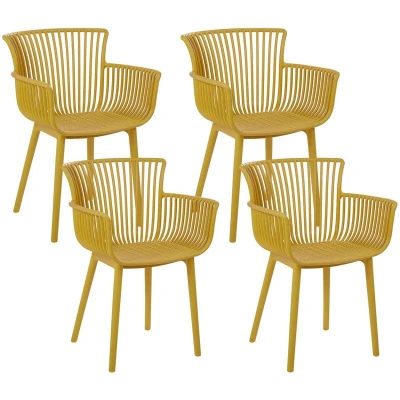 General description 4 Plastic Chairs for Indoor and Outdoor Use. Totally comfortable and super practical, this set of dining chairs is sure to upgrade the look of any space. The chairs are made from plastic, which gives them the advantage of being stain-resistant and suitable for both indoor and outdoor spaces. Featuring a wide seat and a backrest combined with armrests, they are perfect for dining areas, kitchens, or gardens. With a retro-influenced design, the set brings a vintage flair to any décor style. Technical specifications Product Type: Dining Chair Style: Retro General Color: Yellow Main Material: Polypropylene Legs Material: Synthetic Material Seat Material: Synthetic Material Armrests: Yes Foldable: No Stackable: No Dimensions: Armrests Height: 67 cm Depth: 45 cm Seat Height: 44 cm Width: 58 cm Height: 84 cm Seating Surface: 36x40 cm Weight: 6 kg Weight Capacity: 150 kg Installation Assembly Information: Legs to be fitted (approximately 5-15 min). Usage Light water