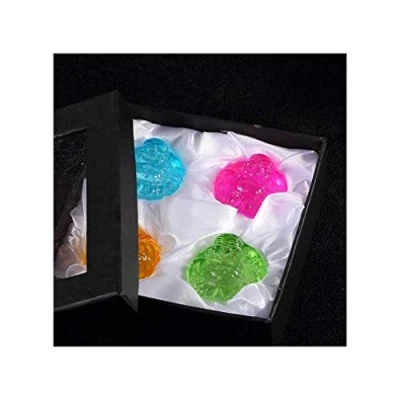 Set of 4 Buddha upper material: synthetic crystal. Set of 4 upper Buddha dimensions: 4 cm high, 4.5 cm wide, 4 cm deep. Box of 4 rear Buddha colours: green, golden yellow, turquoise and pink. Zen and Asian decoration - ideal gift Set of 4 figurines of the famous Eternal Buddha, made of synthetic crystal and in colours