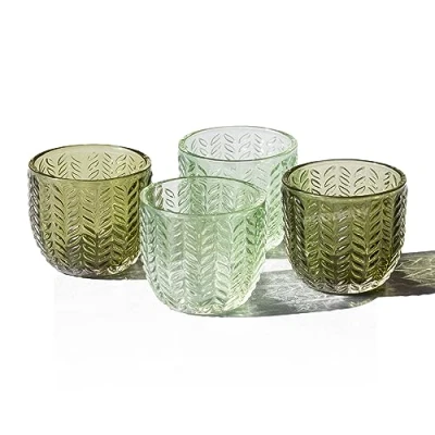 Set of four small glass tea light candle holders that are suitable for free standing on flat surfaces around the home. They are made from clear glass material and come in two different shades of translucent green. The interiors are smooth, while the outsides have an embossed floral pattern. Will fit standard size tea light candles (none are included). Weight: 144 g (approx) Height: 5.8 cm. Diameter #1: 6.5 cm overall. Diameter #2: 4 cm at base