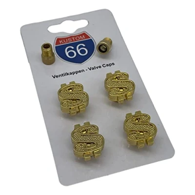 4 valve caps - dollar sign gold - + 2 bicycle adapters for small bicycle valves Original KUSTOM66 EAN: 4260490171741 Suitable for any car, motorcycle and bicycle Great for motorcycles, Harleys, custom bikes, etc. Perfect as a gift for any occasion.