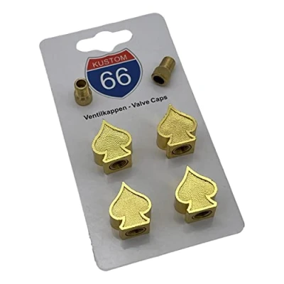 4 valve caps - gold spades - + 2 bicycle adapters for small bicycle valves Original KUSTOM66 EAN: 4260490171796 Suitable for any car, motorcycle and bicycle Great for motorcycles, Harleys, custom bikes, etc. Perfect as a gift for any occasion.