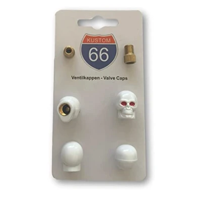 4 valve caps - skull v2 white + 2 bicycle adapters for small bicycle valves Original KUSTOM66 EAN: 4260490171758 Suitable for any car, motorcycle and bicycle Great for motorcycles, Harleys, custom bikes, etc. Perfect as a gift for any occasion.