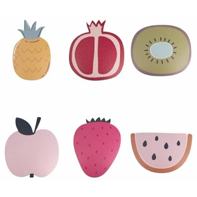 Fruit for One PVC placemat Measurements: Pineapple: 47.5 x 30 cm Pomegranate: 44 x 40.5 cm Kiwi: 44.5 x 37.5 cm Apple: 44 x 39 cm Strawberry: 44.5 x 34.5 cm Watermelon: 44.5 x 29.0 cm 2 2 in 2 Wipe with a damp cloth Available in 6 assortments: pineapple, pomegranate, kiwi, apple, strawberry, watermelon.