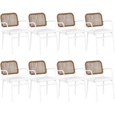 General description This set of 8 metal garden chairs is an excellent choice for enhancing your patio, balcony, or garden. Made from durable, powder-coated aluminum with a stylish white finish, these chairs are resistant to corrosion, water, and UV radiation, ensuring long-lasting use. The woven backrests and soft cushions provide comfortable seating, while their modern design complements any outdoor space. Technical specifications Product Type: Garden Chair Style: Modern General Color: White, Brown Main Material: Aluminium Additional Material: Fabric Legs Material: Metal Seat Material: Aluminium Material Composition: 100% Polyester Armrests: Yes Finish: Powder Coated Foldable: No Stackable: Yes Weight: 3 kg Weight Capacity per Person: 150 kg Dimensions: Height: 82 cm, Width: 46 cm, Depth: 52 cm, Seat Height: 42 cm, Seat Thickness: 5 cm, Armrests Height: 26 cm, Seating Surface: 44x42 cm Seat Foam Density: 22 kg/m3 Usage Light water resistance allows outdoor use, but avoid long-term