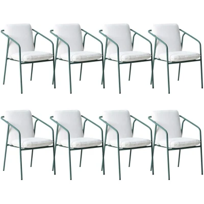 AmazonA set of 8 green garden chairs, ideal for creating a minimalist outdoor relaxation area A minimalist and versatile design with a geometric, open frame and soft white cushions fits various arrangement styles Made from powder-coated metal, the chairs are resistant to changing weather conditions and corrosion The chairs are designed to be stackable, which allows for easy storage The product is fully assembled and ready for use