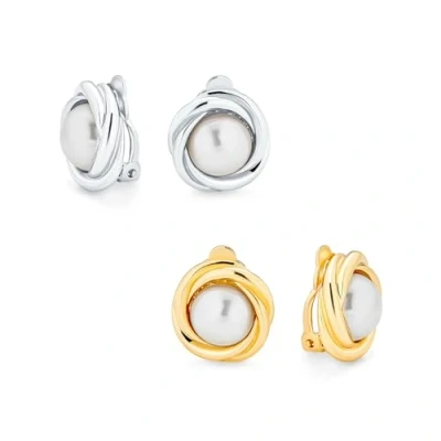 Set Of Two Cable Bezel Dome White Simulated Pearl Clip On Earrings For Women Non Pierced Ears 14K Gold Plated
