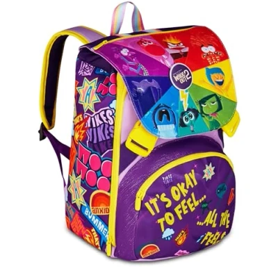 Dimensions: 27 x 39 x 16 cm - closed capacity 24 L; open 27 L Back: pre-shaped; Straps: padded and covered with fabric and mesh Separable backpack with front pocket and side mesh water bottle pocket. Coloured zips. Digitally printed on glossy glittering pvc and emotion indicator applied on the front panel. Printed ribbon handle. Fabric: Polyester The Inside Out 2 Detachable Backpack is the perfect choice for girls looking for a roomy, comfortable backpack with a colourful design! Ideal for primary school, thanks to the side zips, you can get even more space.