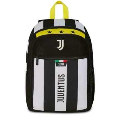 Dimensions: 28.5 x 42 x 23 cm - capacity: 26 litres Backrest: Padded and covered with fabric. Shoulder straps: padded and covered with fabric. Double compartment backpack with front pocket. Side mesh water bottle pocket. Rubber logo patch Screen printed stars. Screen printed lettering Reflective label. Custom pull with jacquard ribbon. Contrast two-tone zip Fabric: Polyester The Juventus Double Compartment Backpack is the perfect choice for children who are looking for a large, comfortable backpack of their favourite team! Ideal for primary and middle school!
