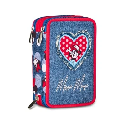 Seven Minnie 3 Zip Pencil Case, Denim Blue, Triple Compartment Pen Holder Complete with Pens, Pencils, Colours, Elementary Schools, Girls, Blue Denim, Modern
