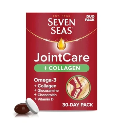 JointCare + COLLAGEN for 4-IN-1 JOINTCARE SUPPORT 1-4, helps you maintain an active lifestyle 1-4. It supports 4 important components of your joints: Cartilage1, Bones2, Muscles3, and Connective Tissue4 4 KEY INGREDIENTS: Omega-3, Collagen, Glucosamine & Chondroitin 85 YEARS OF OMEGA-3 EXPERTISE: With Premium Omega-35 to help support the normal function of your heart6, brain7 and eyes7 EASY TO TAKE: Take 1 JointCare capsule + 1 Collagen tablet a day with cold water. Easy to swallow, 30-day duo pack CONTENTS: x30 capsules of Seven Seas JointCare, with Omega-3, Glucosamine and Chondroitin. Plus, Vitamins C and D, Zinc and Manganese to support an active lifestyle1-4. x30 Collagen tablets. 30-day duo pack Ingredients Quantity per 1 capsule Vitamins Vitamin D 5 μg 100%NRV* Vitamin C 30mg 37.5 %NRV* Minerals Zinc 2mg 20 %NRV Manganese 0.5mg 25%NRV Other Ingredients Glucosamine Sulphate 2KCI 330mg Chondroitin Sulphate 13.5mg Fish Oil 307mg providing Omega-3 184mg of which EPA 92mg of which DHA 61mg