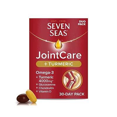 JointCare plus TURMERIC for 4-IN-1 JOINTCARE SUPPORT 1-4, helps you maintain an active lifestyle 1-4. It supports 4 important components of your joints: Bones1, Muscles2, Cartilage3, and Connective Tissue4 4 KEY INGREDIENTS: Omega-3, Glucosamine and Chondroitin, with 4000 mg Turmeric 85 YEARS OF OMEGA-3 EXPERTISE: With Premium Omega-35 to help support healthy heart6, brain7 and eyes7 HOW TO USE: Take 1 JointCare capsule plus 1 Turmeric tablet a day with cold water during a meal. 30-day duo pack CONTENTS: x30 capsules of Seven Seas JointCare, with Omega-3, Glucosamine and Chondroitin. Plus, Vitamins C and D, Zinc and Manganese to support an active lifestyle1-4. x30 Turmeric tablets containing 4000 mg root (as 85 mg extract). 30-day duo pack
