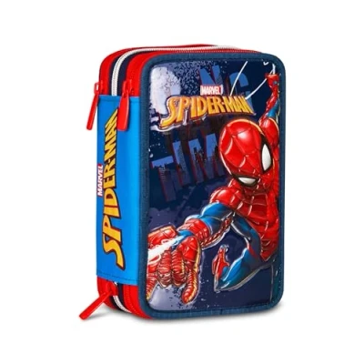 Seven Spiderman School Pencil Case 3 Zip, Blue, Triple Compartment Pen Holder Complete with Pens, Pencils, Colours, Backpack Accessories, Elementary Schools, Children, Modern