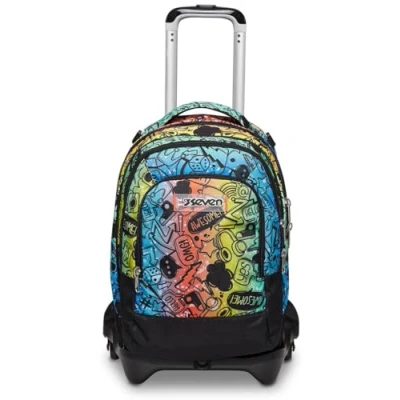 DIMENSIONS: 33x52x31 with structure, 32x46x30 without structure; Capacity: 47 lt Backrest: Padded and covered in fabric. Shoulder straps: Padded and covered in fabric. Detachable front pocket via zip that becomes a backpack with shoulder straps in ribbon, inside pocket for water bottle. Decomposable trolley with maxi wheels 10 cm. Crossover System with clips for attaching tapes. Double telescopic bar with two height adjustments, reinforced bottom and corner guards. 3 possible uses: 1) trolley use with full retractable shoulder straps in the backrest; 2) backpack use without unhooking the cart; 3) backpack use when completely unhooked from the cart. New custom rubber label with SEVEN logo