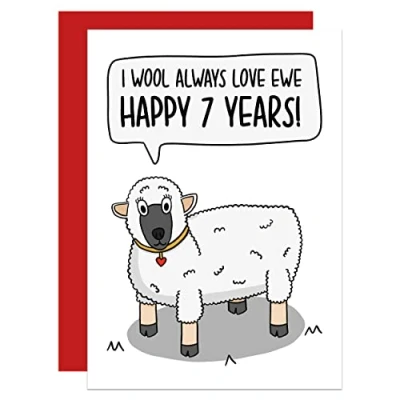 Seventh Anniversary Card, Wedding A6 Wool Anniversary, Funny Sheep Pun Card for Husband, Wife, Seven Year (Wool 7 Year)