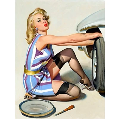 SEXY PIN UP GIRL CHANGING TYRE RETRO METAL FRIDGE MAGNET 100MM X 75MM (614F)
