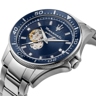 Product Specifications Brand: MaseratiModel: R8823140007Movement: Automatic (Japanese)Case Size: 44mmCase Material: Stainless steelBand Material: Stainless steelDial Colour: BlueGlass: Sapphire crystalWater Resistance: 100m or 10ATMWarranty: 2 years Timepiece International warrantyProduct DescriptionIntroducing the Maserati Automatic Stainless Steel Bracelet Blue Dial Men's Watch – a masterpiece that embodies the spirit of automotive luxury and precision craftsmanship. Immerse yourself in the world of Maserati, where elegance meets performance, and elevate your wristwear with this sophisticated timepiece.Powered by an automatic Japanese movement, this watch captures the essence of Maserati's commitment to performance and innovation. The self-winding mechanism ensures precision timekeeping, making every moment an expression of luxury and sophistication.The 44mm stainless steel case boasts a sleek and modern design, reflecting the iconic aesthetics of Maserati. Meticulously crafted, it provides the perfect canvas for the captivating blue dial, creating a timepiece that effortlessly merges classic and contemporary elements.The stainless steel bracelet complements the case seamlessly, offering durability and a polished finish. With a link bracelet design that ensures a comfortable fit, this watch adds a touch of automotive elegance to your wrist, making it a statement piece for any occasion.The dynamic blue dial serves as a captivating focal point, inspired by the allure of Maserati's iconic vehicles. With refined hour markers and hands, the dial achieves a perfect balance of sophistication and sportiness, reflecting the brand's legacy in the automotive world.Protected by scratch-resistant sapphire crystal, the dial remains clear and pristine, ensuring lasting clarity and durability. This premium crystal not only enhances the longevity of the watch but also provides an unobstructed view of the meticulously crafted blue dial.With an impressive water resistance of 100 meters or 10ATM, the Maserati Automatic watch is designed for the active gentleman. Whether you're navigating your daily routine or indulging in water sports, wear it confidently, knowing it can withstand various environments.