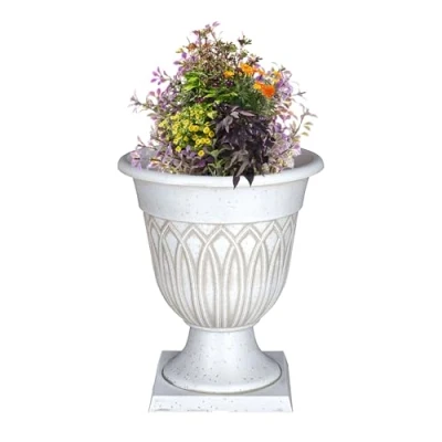 HIGH QUALITY: This hand-painted tampa urn plant pot is made from recycled plastic which is durable and looks dazzling with its striking distinctive design. SG Traders large premium planters and tampa urns are not only aesthetically pleasing, but also durable and long-lasting, making them a great investment for any gardening enthusiast. SG Traders is committed to providing customers with the highest quality planters, and their selection of planters and urns is no exception. GREAT DESIGN: It has a unique design with a 13" Tampa URN hand-crafted urn features an attractive exterior design highlighted by the colour wash. SG Traders is proud to offer a wide variety of beautiful and durable outdoor decor, including our exquisite Bell lattice hand-crafted urn. This stunning piece is hand-crafted from high-quality materials, ensuring a long-lasting and attractive exterior design that will add a touch of elegance to any outdoor space. UV RESISTANT: The plastic material of the garden tampa urn planter guarantees frost resistance as well as UV resistance to withstand harsh weather. We're proud to offer our customers the Bell lattice hand-crafted urn, a stunning piece that is both UV-resistant and weather-resistant. Made from high-quality materials, this urn is designed to withstand the elements and maintain its attractive exterior design. SG Traders Bell lattice hand-crafted urn is an excellent choice for any home garden. TAMPA URN POT SPECIFICATIONS: SG Traders large plant pot urn dimensions which are displayed in the description are the outer edge/lip measurements. (Outer edge to outer edge). Width 33cm x Height 39cm KEY FEATURES: The tampa urn is made from high-quality materials and comes with four predrilled holes, making it easy to install and secure in place. With its intricate design and durable construction, this urn is sure to be a long-lasting and beautiful addition to your home. This tampa urn is designed to add a touch of elegance and charm to any garden or outdoor space. Don't miss out on the chance to elevate your outdoor decor with the SG Traders tampa urn from SG Traders.