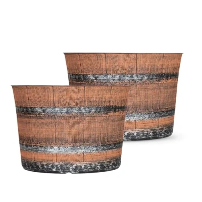 SG Traders Round Plastic Whisky Barrel Garden Pot Flower Pots Planter Tub Patio Outdoor Traditional Brown with Silver Bands Plant Outdoors Drainage Holes (Pack of 2)