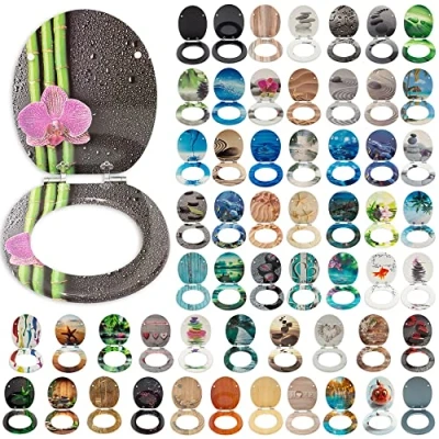SG Traders Toilet Seat Covers: Wooden core toilet seat with timeless and modern 3 sided design printed. The toilet lid (top and bottom) and the toilet seat are printed on the top. The underside of the seat is classic white. SG Traders Toilet Seat Covers are available in 59 beautiful different designs. SG Traders offers with a moisture-resistant, pore-free surface for the toilet seat covers. Easy To Install: Wooden core toilet seats come in standard size with adjustable hinges so they fit on almost all commercial toilet bowls (wall-mounted or pedestal). It’s Quick and easy installation that thanks to the quick-fastening set included. SG Traders modern, high-quality toilet seat with wooden core, chrome-plated stainless steel hinges and integrated soft close assures gentle, silent toilet lid and seat closure. Soft Close: This toilet seat lid closes pleasantly and quietly. The loud banging is the past. A light tap is enough and the lid of the toilet seat lowers quietly and gently. This is not only comfortable but does not damage the toilet seat and ceramics. The toilet lid is easy to care for due to the smooth MDF surface and allows easy hygienic cleaning. Easy To Clean: SG Traders stylish toilet seat cover's smooth surface of the toilet lid is impressively hygienic and easy to clean, suitable for standard commercial cleaning products and offers maximum hygiene. High-quality, strong MDF and sturdy metal hinges also ensure durability and excellent stability. Dimensions: SG Traders stylist toilet seat cover size: 42.5 x 35.8 cm (L x W), Seat size: 43.7 x 37.8 cm (L x W), Aperture size: 28 x 24 cm (L x W) and Height: 5.3 - 5.5 cm., Manufacturer: SG Traders