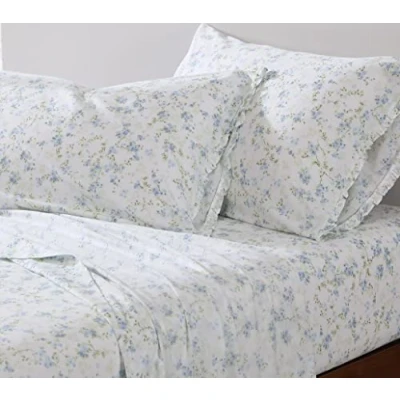 Shabby Chic® King Sheets, Soft & Breathable Organic Cotton Bedding Set, Floral Home Decor with Ruffled Pillowcases (Ella Blue, King)
