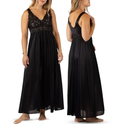 FIGURE FLATTERING DESIGN. This striking, feminine nightgown will leave you feeling like the belle of the ball, even while you sleep. The gown gently gathers below the beautiful, patterned bodice lace across the neckline, softly accentuating your feminine features. ELEGANT AND GRACEFUL. Soft luxurious European stretch lace yoke & lace sleeveless bodice add a touch of feminine flare to this tasteful and classy nightgown. COMFORTABLE SILKY FEEL. Our nightgown is made from breathable, USA made Satintrique Nylon Tricot to leave you feeling cool and comfortable. LONG AND FLOWING. A sophisticated cut that gathers beautifully and sweeps gracefully at your feet, measuring 53” in length from shoulder to hem. CONVENIENT CARE AND TRAVEL: Wrinkle resistant material for easy packing and travel. Machine wash in a warm, gentle cycle with like colors. Do not bleach. Tumble dry low. Warm iron if desired.