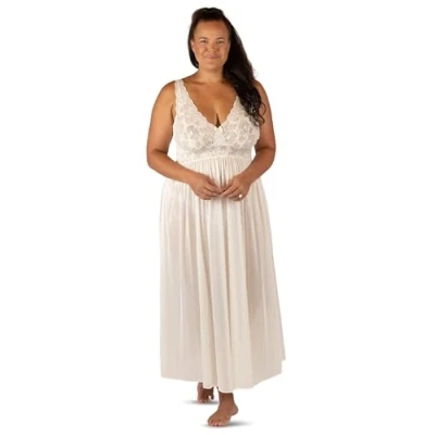 FIGURE FLATTERING DESIGN. This striking, feminine nightgown will leave you feeling like the belle of the ball, even while you sleep. The gown gently gathers below the beautiful, patterned bodice lace across the neckline, softly accentuating your feminine features. ELEGANT AND GRACEFUL. Soft luxurious European stretch lace yoke & lace sleeveless bodice add a touch of feminine flare to this tasteful and classy nightgown. COMFORTABLE SILKY FEEL. Our nightgown is made from breathable, USA made Satintrique Nylon Tricot to leave you feeling cool and comfortable. LONG AND FLOWING. A sophisticated cut that gathers beautifully and sweeps gracefully at your feet, measuring 53” in length from shoulder to hem. CONVENIENT CARE AND TRAVEL: Wrinkle resistant material for easy packing and travel. Machine wash in a warm, gentle cycle with like colors. Do not bleach. Tumble dry low. Warm iron if desired. Note: Kindly check and measure with Size Chart before selecting size