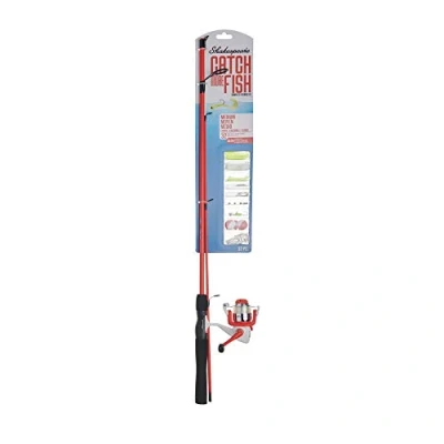 SHAKESPEARE FISHING KIT: Grab everything you need to enjoy a day of fishing with the Shakespeare Catch More Fish Medium Spinning Fishing Rod and Reel Combo. It's a perfect option for youth and novice anglers. 5'6", MEDIUM POWER, 2-PIECE FISHING ROD: The tubular fiberglass construction provides extra durability with 5 stainless steel guides to help smoothly guide your line. 6-12lb Line Rating. SIZE 30 SPINNING FISHING REEL: Designed for right/left handed anglers. Features a gear ratio of 5.2:1 and a multi-stop anti reverse that provides more control over the line. Pre-spooled with 8lb fishing line. Mono Capacity yd/lb: 190/4 140/6 110/8. INCLUDES LIVE BAIT TACKLE: Catch More Fish fishing combos also include 1" red and white bobbers, split shot weights, hooks, a spinner grub, chartreuse grubs, white grubs, chartreuse tubes, jig heads and swivels. COMFORTABLE HANDLE DESIGN: A Full EVA handle provides a comfortable, secure grip for long days on the water. Spinning reel seat.