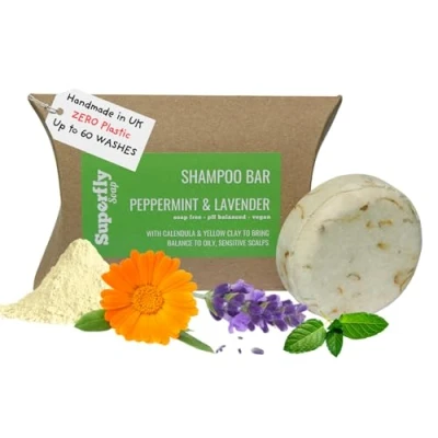 BAR SHAMPOO WITH NATURALLY DERIVED INGREDIENTS: Our handcrafted natural shampoo bar for greasy hair is made using 99% naturally derived premium ingredients. These are silicone free, sulfate free and SLS free shampoo bars handmade in the UK. Formulated for normal hair with a peppermint and lavender fragrance. OUR SOAP FREE SHAMPOO BAR GENTLY CLEANSES AND HYDRATES with a luxurious instant lather, even in hard water! No adjustment period needed if changing to a shampoo block/solid bar from regular shampoos. Calendula and yellow clay help to balance oily, sensitive scalps. ECO FRIENDLY AND VEGAN HAIR SHAMPOO BAR: Our chemical free shampoo bar comes in ocean friendly packaging with zero plastic, eliminating waste completely. Suitable for vegans and 100% cruelty free. There isn’t a more eco friendly shampoo for greasy hair. DEEPLY NOURISHING AND HYDRATING FOR HEALTHY HAIR: Enriched with Keratin and vitamin Pro B5 to help strengthen your hair from the roots, this shampoo bar for greasy hair is purposefully PH balanced to leave hair healthy and shiny. ZERO WASTE & PERFECT AS A TRAVEL SHAMPOO BAR: Superfly’s premium round shampoo bar is a handmade zero waste product, ecologically packaged with zero plastic. Contains no sulphates, colourants or palm oil, making for ideal eco gifts. Shampoo in a bar form is allowed in hand luggage unlike traditional liquid varieties. Whilst also being lighter, smaller, easier to carry, and with no chance of leaking and ruining your trip. GENTLE CLEANSING AND HEALTHIER HAIR AND SCALP. Not to be confused with cheaper shampoo hair bars, often using Sodium Coco Sulfate and other nasty ingredients, we only use pure premium ingredients in our naturally derived vegan shampoo bar. It was developed to cleanse and moisturise without stripping away your hair's natural oils.