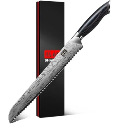 Powder Steel Bread Knife: SHAN ZU's kitchen serrated knife is made of high-carbon Japanese powder steel (63HRC), harder than 99% of ordinary steels. Crafted with advanced metallurgical technology, it offers excellent rust resistance and durability, extending the knife's lifespan 12° Ultra-Sharp Blade: Longer than standard bread knives, the 25 cm blade features a wavy tooth design hand-polished to 12° for exceptional sharpness. It effortlessly slices bread, cakes, and large fruits like pineapples, watermelons, and cantaloupes. Fashion Laser Engraved Pattern: Combining traditional aesthetics with modern elements, the blade features a stylish laser-engraved texture. Note: This is not a Damascus knife. Ergonomic Wood Handle: The handle,crafted from durable Pakkawood, ensures optimal balance and comfort during prolonged use. Its ergonomic design provides a perfect grip without causing fatigue High-End Gift Box & Customer Service: Packaged in a custom black luxury gift box, this knife makes an ideal gift. Our 24/7 customer service team is ready to assist you with any questions., Weight: 0.8598028218 Pounds, Manufacturer: SHAN ZU